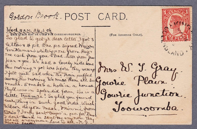 Gordon Brook, 20 km from Kingaroy. was a receiving office from 1900 to late 1906. Manuscript name dated 24 January 1906 with Kingaroy datestamp dated the same day. Seen on Ebay